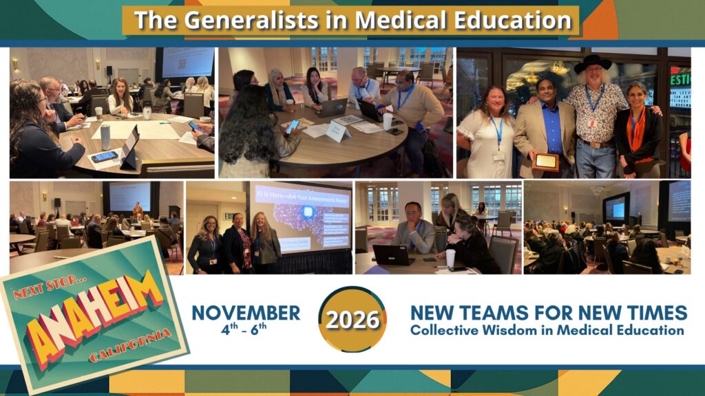 The Generalists in Medical Education welcome basic scientists, clinicians, and other educators interested in medical education. We are educators who teach, conduct research, and provide support services in all areas of predoctoral, postdoctoral and continuing medical education and health professions education. Specific areas of interest include curriculum and faculty development, testing and evaluation, and student services. At each annual conference, we exchange ideas and knowledge to enhance our professional growth. Each conference offers opportunities to develop understandings of the latest initiatives and innovations in medical education and to explore solutions to educational problems.